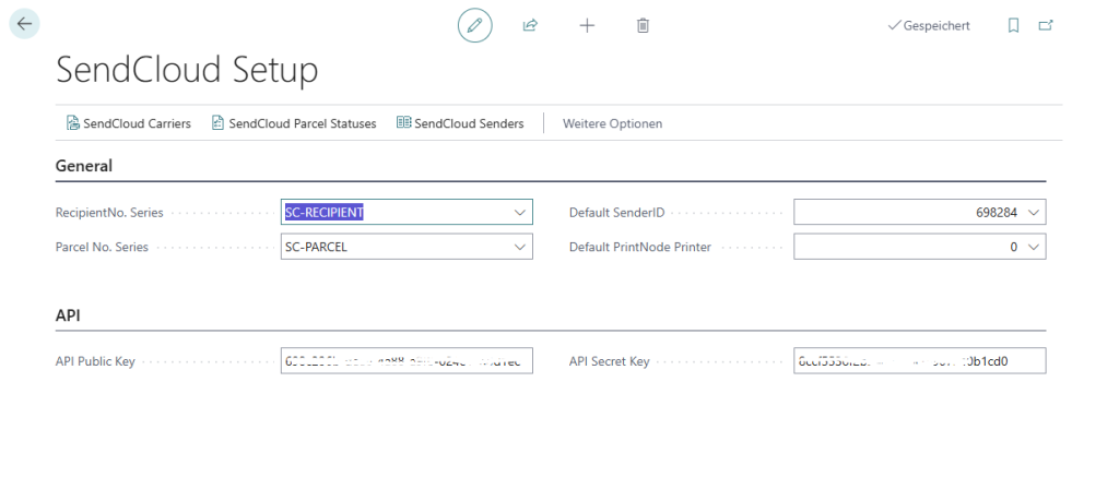Es mĂźssen API Key und Secret aus der SendCloud Integrationen-Einstellung eingetragen werden.
